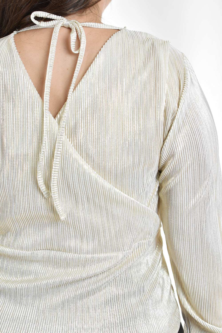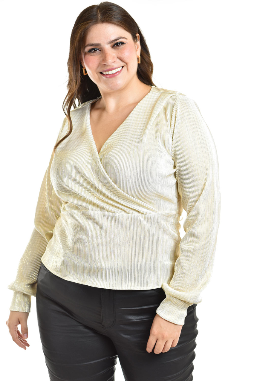 Esta elegante blusa está diseñada con un atractivo tejido plisado que aporta un toque de brillo ideal para ocasiones especiales. Su escote cruzado en V estiliza la figura, mientras que las mangas largas añaden un estilo sofisticado. La parte posterior cuenta con un lazo que se ajusta a la espalda, permitiendo un ajuste personalizado. Es perfecta para combinar con pantalones de cuero o faldas para un look moderno y glamuroso. ¡Ideal para eventos nocturnos o celebraciones! Sin strech. El fit viene a la medida, por lo que se recomienda solicitarlo a su talla; La modelo usa talla 38 y mide 1.78. Corte: Curvy, Plus Size, Talla Extra.Composición: 90% poliester, 10% spandex.