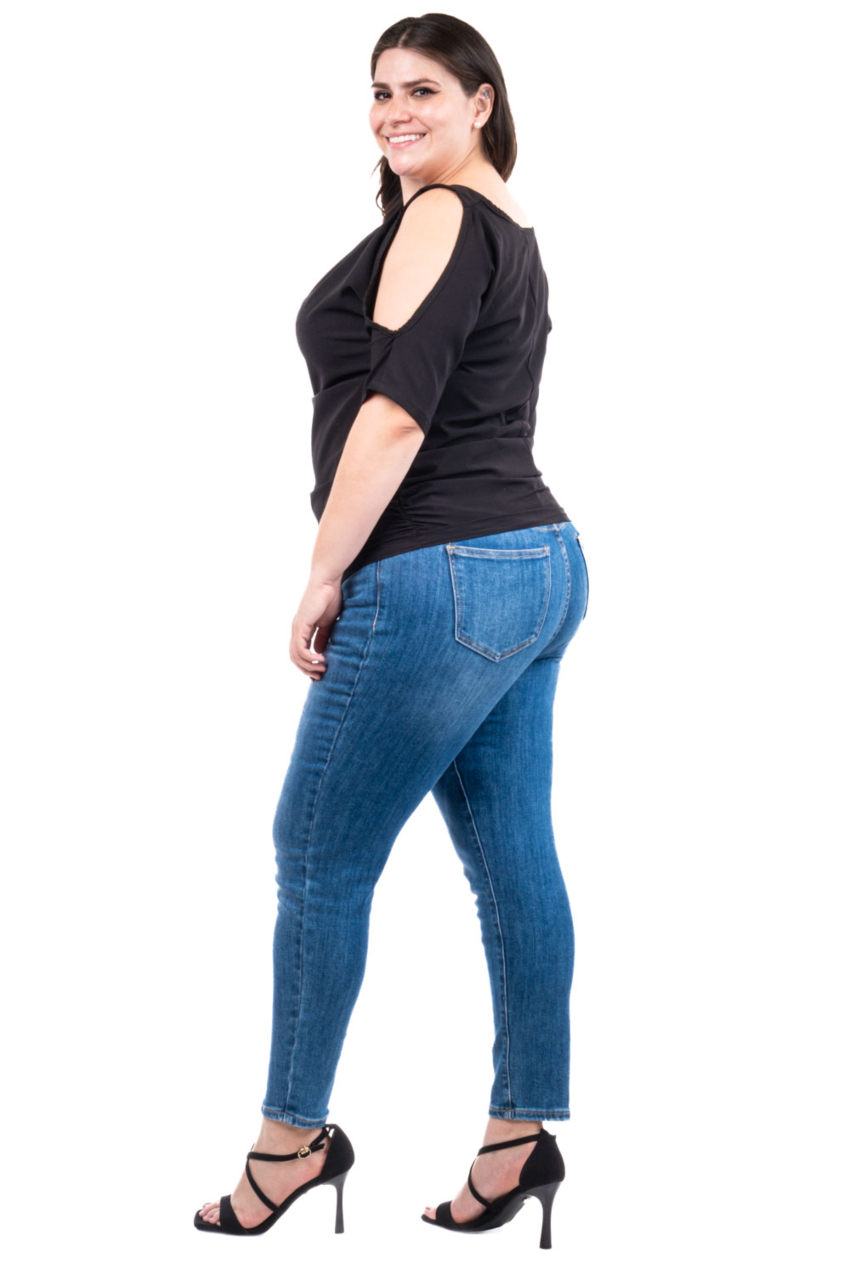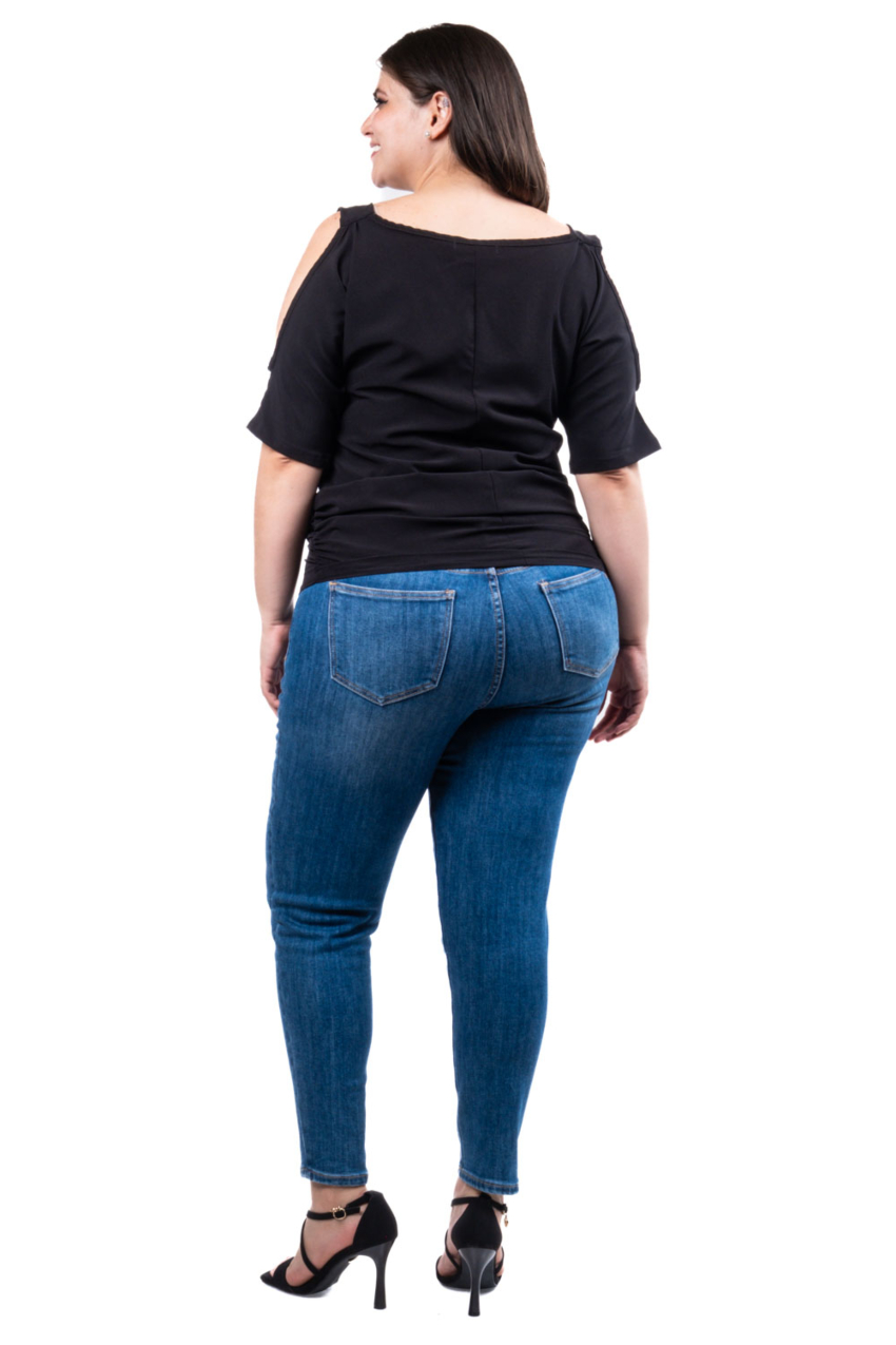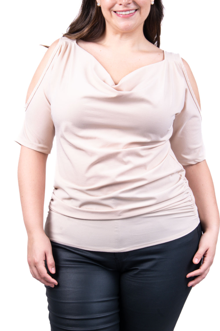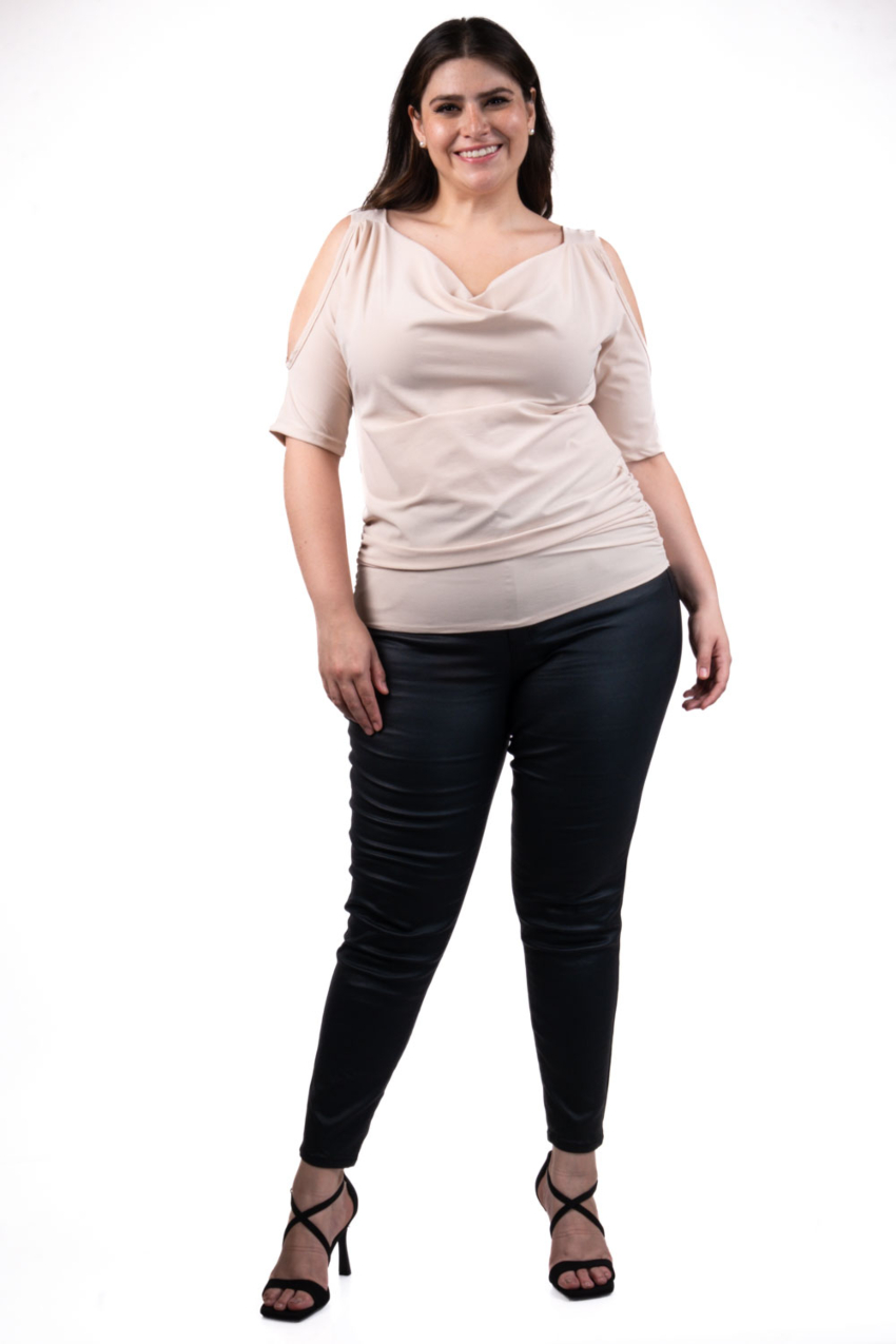 Blusa con diseño moderno y femenino. Presenta un elegante escote y costados con detalle drapeado y aberturas en los hombros que añaden un toque sofisticado y a la vez casual. Confeccionada en un tejido suave y elástico, esta blusa se adapta cómodamente a la figura, ofreciendo un ajuste favorecedor. Ideal para combinar con jeans o pantalones ajustados, es perfecta tanto para un look casual como para ocasiones más formales. El fit viene a la medida, por lo que se recomienda solicitarlo a su talla; la modelo usa talla 36 y mide 1.78. Corte: Curvy, Plus Size, Talla Extra. Corte: Curvy, Plus Size, Talla Extra. Composición: 90% poliéster, 10% spandex.